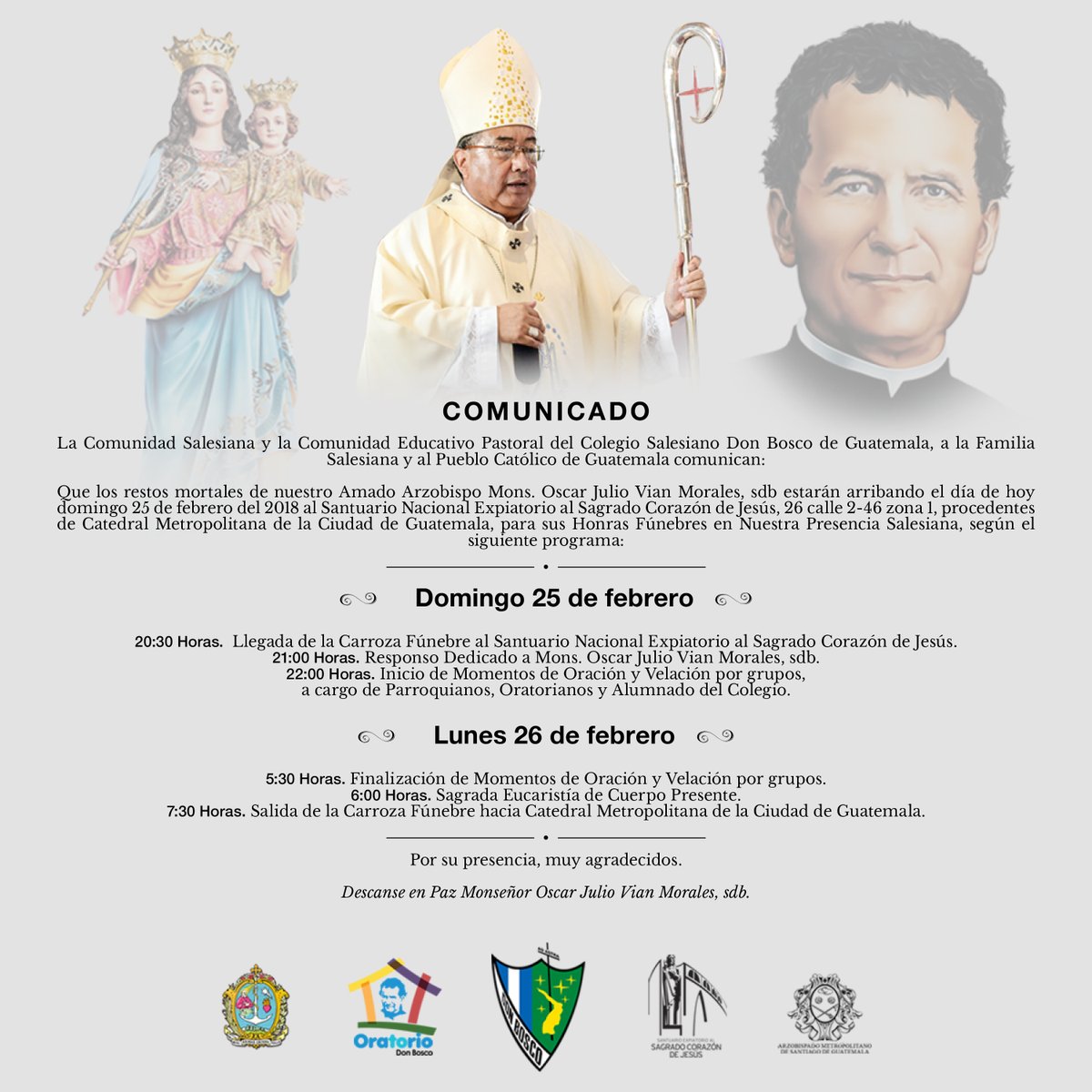 Los restos mortales del arzobispo metropolitano, Óscar Julio Vian, serán trasladados este domingo de la Catedral Metropolitana hacia las instalaciones del Santuario Nacional Expiatorio “Sagrado Corazón de Jesús”, ubicadas en la 26 calle 2-46 de la zona 1 para recibir honras fúnebres por parte de la comunidad salesiana, informó mediante un comunicado las comunidades Salesiana y Educativa Pastoral del Colegio Salesiano Don Bosco de Guatemala.