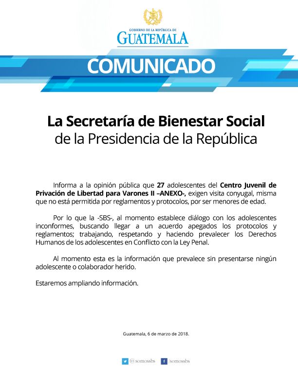 Luego de reportarse movimientos inusuales en los alrededores del Correccional Las Gaviotas en zona 13, la Secretaría de Bienestar Social de la Presidencia (SBS) dio a conocer en un comunicado lo que sucede con los internos.