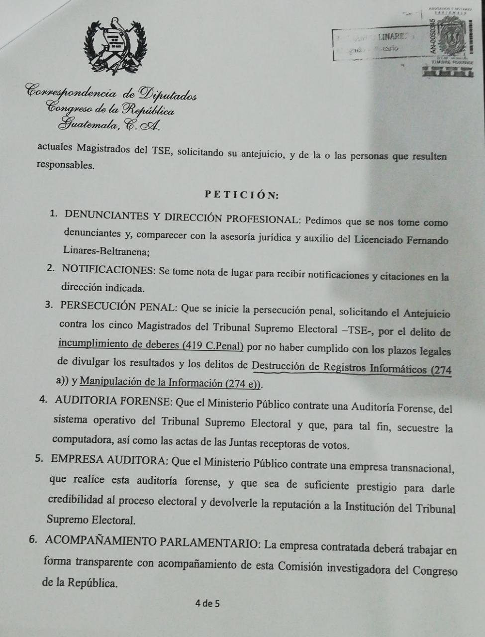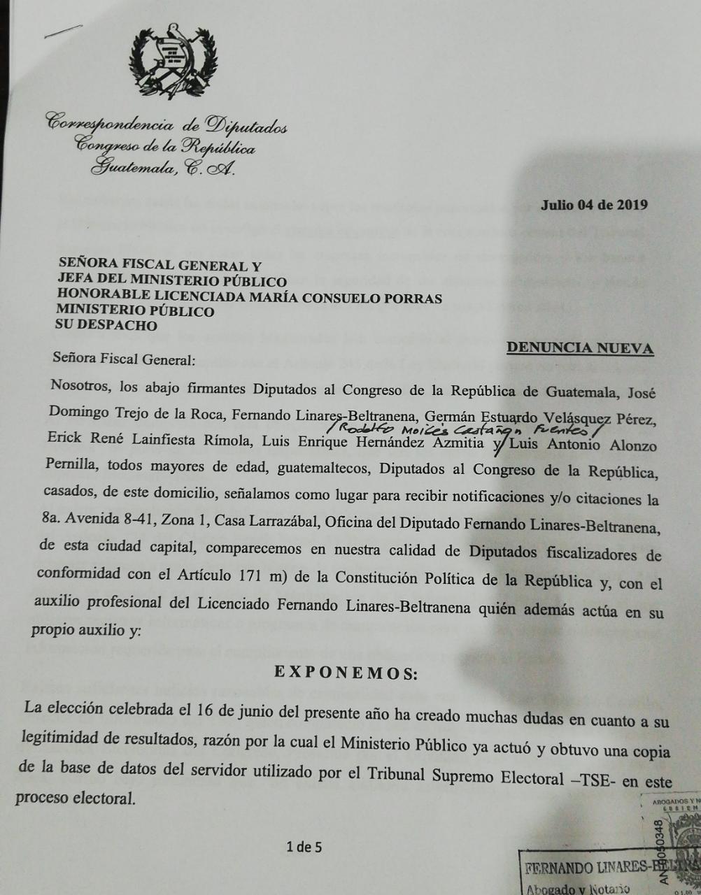 Los diputados denunciantes, además de Linares Beltranena y Hernández Azmitia, son Domingo Trejo, Germán Velásquez, Erick Lainfiesta, Luis Alonzo y Rodolfo Castañón.