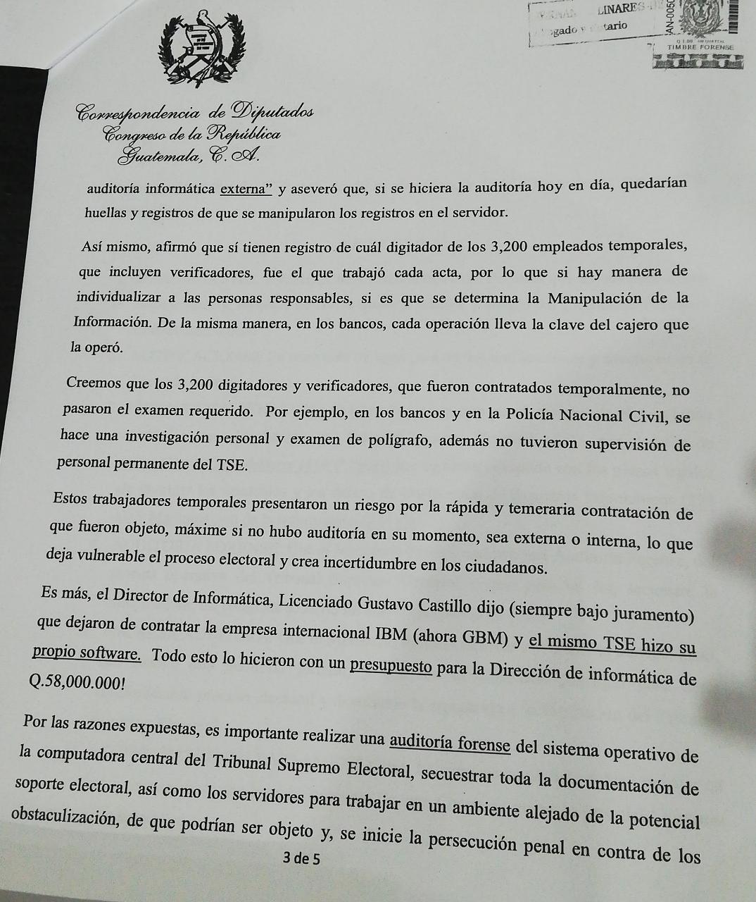 Los diputados son miembros de la Comisión de Asuntos Electorales, a la cual la Dirección de Informática del TSE entregó copia de las actas de votación del departamento de Guatemala, a solicitud del parlamentario Luis Hernández Azmitia.