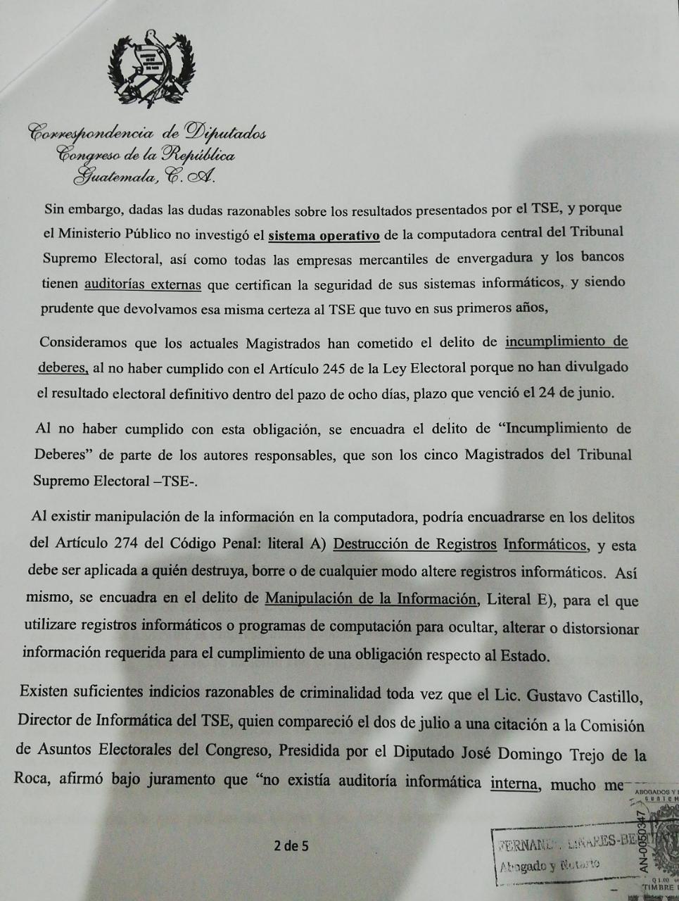 Según ellos, los magistrados del TSE cometieron el delito de incumplimiento de deberes, al no haber cumplido con el artículo 245 de la ley electoral, porque no han divulgado el resultado electoral definitivo dentro del plazo de ocho días, el cual venció el pasado 24 de junio.