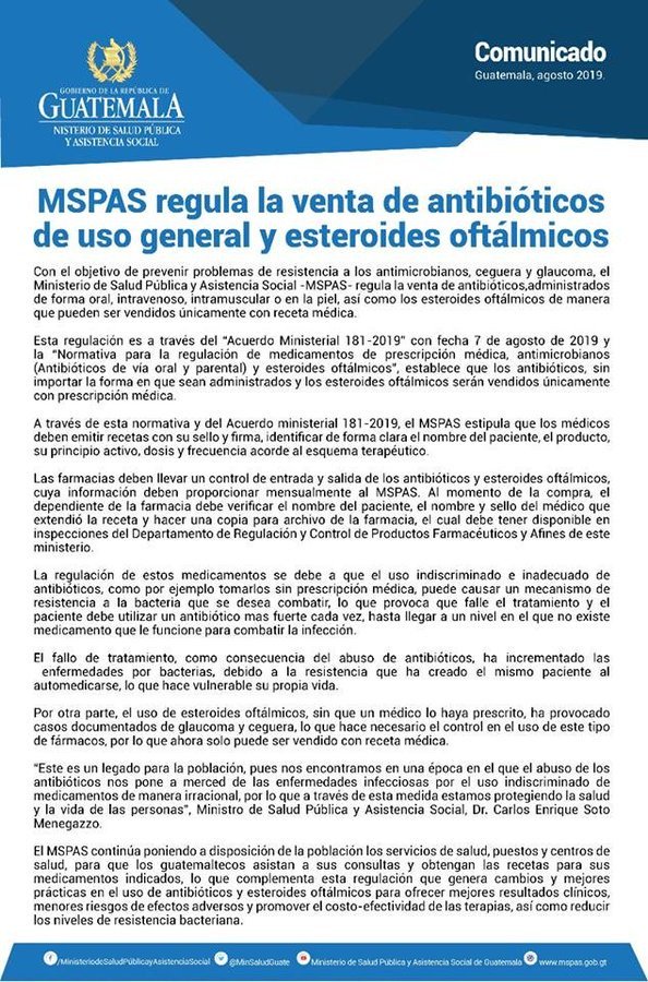 De acuerdo con el funcionario, la medida, que se implementa por primera vez en Guatemala, cobró vigencia desde el pasado 7 de agosto. Con la implementación de esta resolución, las farmacias tienen prohibido vender, sin receta médica, antibióticos de uso general y los esteroides oftalmológicos que son administrados ya sea de forma oral, intravenoso o intramuscular.