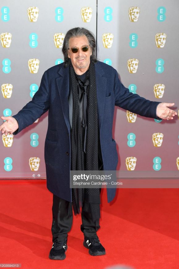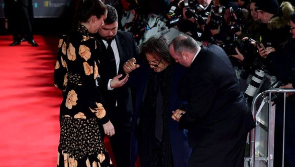 Al Pacino tropezó y cayó en la alfombra roja de los BAFTA. El famoso caminaba junto a su novia Meital Dohan.