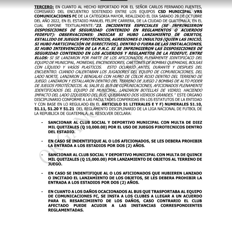 El Órgano Disciplinario de la Liga Nacional de Guatemala multó con 25 mil quetzales al CSD Municipal por los incidentes reportados por el Comisario Carlos Fuentes en el Clásico ante Comunicaciones.