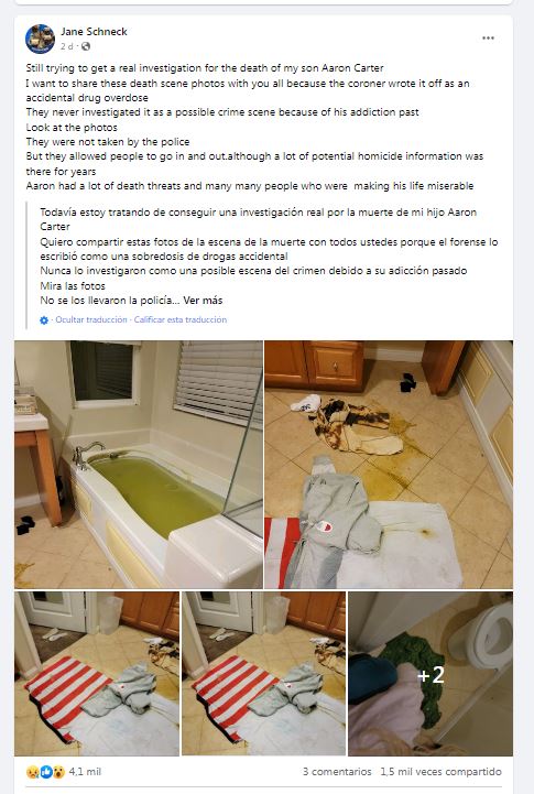 "Todavía estoy intentando que se realice una investigación por la muerte de mi hijo, Aaron Carter", escribió Jane en su publicación. "No quisieron analizar otras hipótesis ni considerar que estaban ante la potencial escena de un crimen por el pasado como persona adicta de Aaron", agregó.