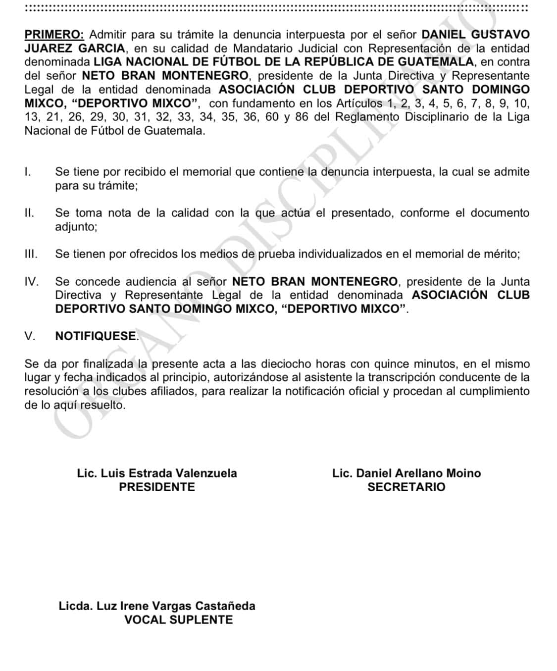 La Liga Nacional de Fútbol de la República de Guatemala ha presentado una denuncia contra Neto Bran Montenegro, presidente de la junta directiva y representante legal del Deportivo Mixco. La denuncia, interpuesta a través del licenciado Daniel Gustavo Juárez, mandatario judicial de la Liga Nacional, acusa a Bran de "agravio público por parte de oficiales".