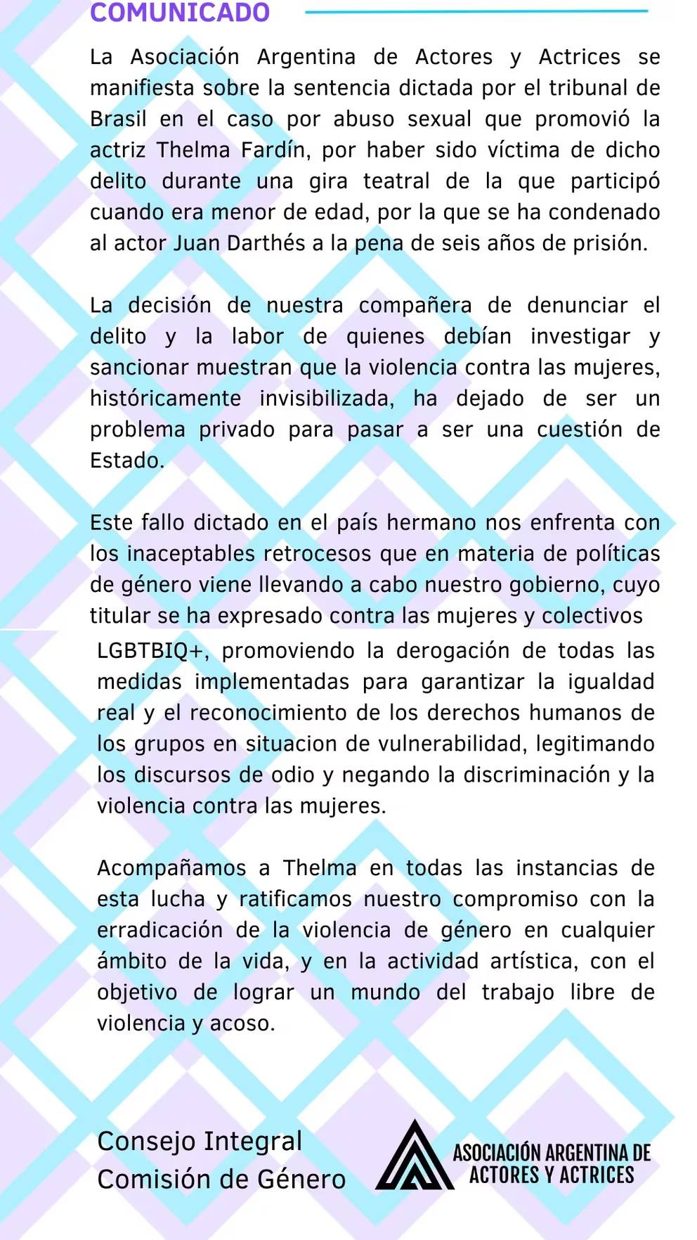 Tras el fallo, desde la Asociación Argentina de Actores y Actrices se publicó un comunicado que lleva por nombre Justicia para Thelma. En él, detallan: