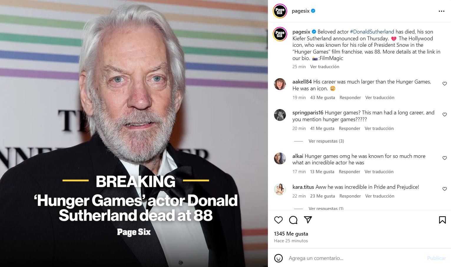 "Con gran pesar, les digo que mi padre, Donald Sutherland, ha fallecido", escribió Kiefer Sutherland, el hijo de Donald Sutherland, en una publicación en Instagram el jueves.