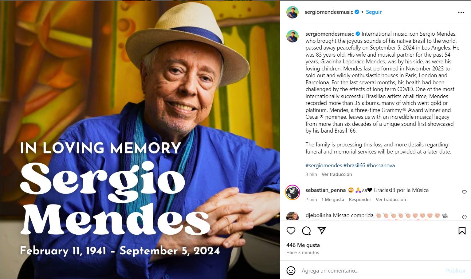 "Su esposa y compañera musical durante los últimos 54 años, Gracinha Leporace Mendes, estuvo a su lado, al igual que sus amados hijos", dijo el comunicado.