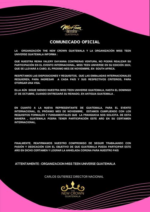 "La organización Miss Teen Universe Guatemala desea informar a la comunidad y a todos los interesados que, tras el reciente comunicado sobre la ausencia de nuestra actual reina en el evento internacional, hemos tomado la decisión de enviar a una de nuestras cuatro finalistas.