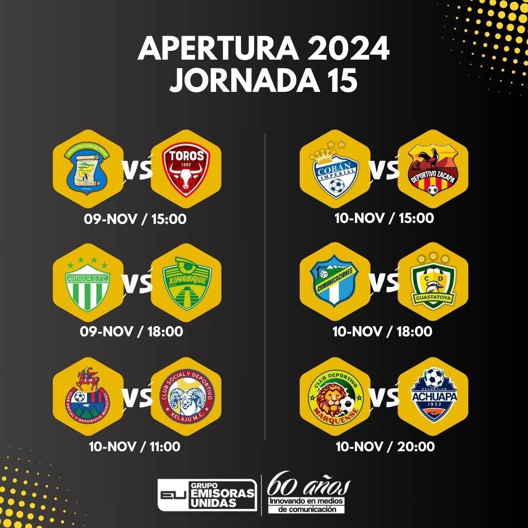 La jornada arranca el sábado 9 de noviembre a las 15:00 horas con el duelo entre Deportivo Mixco y Deportivo Malacateco en el estadio Santo Domingo de Guzmán. Ahí, los “Toros” buscarán su quinto triunfo consecutivo. Anteriormente, Malacateco venció a Achuapa (0-2), Municipal (4-0), Xelajú M. C. (1-0) y Comunicaciones (2-0).