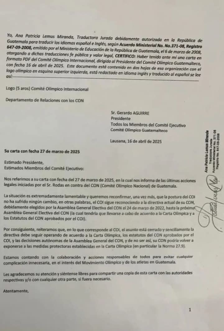 "Nos referimos a su carta con fecha del 27 de marzo de 2025, en la cual nos informan de las últimas acciones legales iniciadas por el señor Jorge rodas en contra del CON (Comité Olímpico Nacional) de Guatemala. La situación es extremadamente lamentable y queremos reconfirmar, una vez más, que la postura del CON no ha sufrido ningún cambio, en otras palabras, el COI sigue reconociendo a la directiva actual de su CON", expresa el Departamento de Relaciones con los CON.