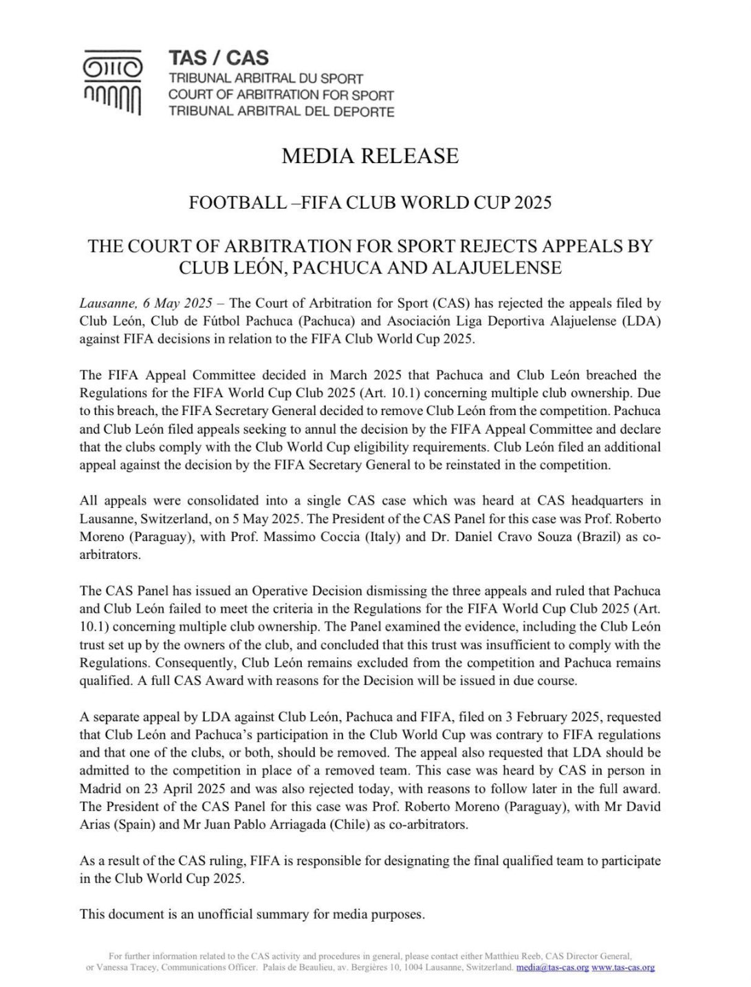 Adicionalmente, la apelación interpuesta por Alajuelense —en la que solicitaba la eliminación de León y Pachuca y su inclusión en el torneo— también fue desestimada. Este proceso fue tratado por un panel diferente del TAS en una audiencia realizada el 23 de abril en Madrid, concluyendo de forma paralela al caso principal. Los motivos completos de ambas resoluciones serán publicados por el TAS en los próximos días.