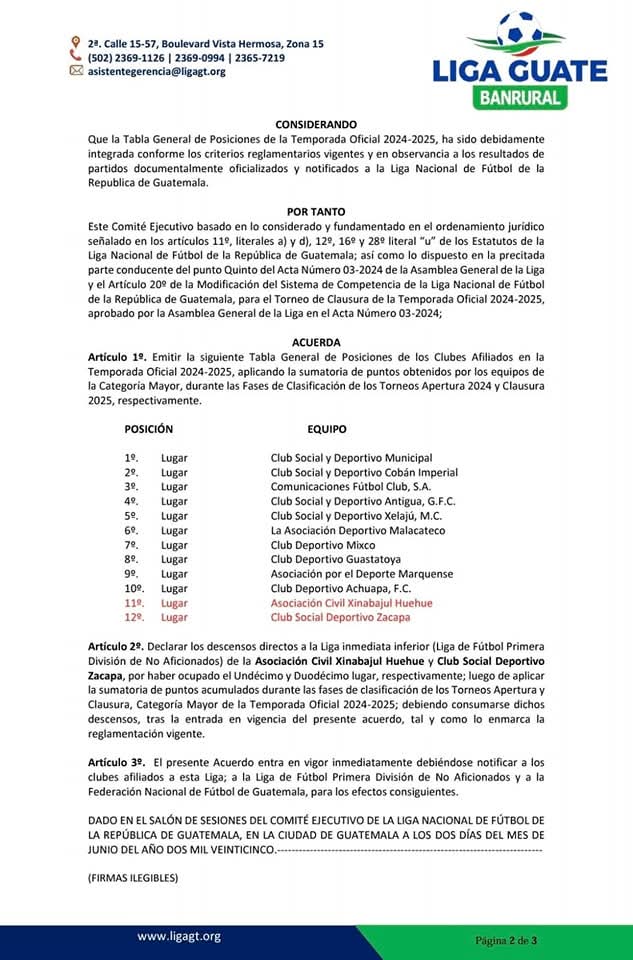 En ese sentido se acuerdan tres artículos; el primero hace referencia a la tabla de posiciones de la temporada 2024-2025, donde Xinabajul quedó oficialmente en la posición 11 y Deportivo Zacapa en la posición 12.