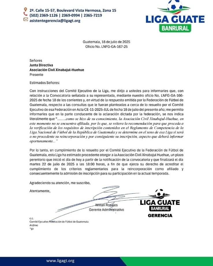 En esa línea, y tras la nota de la Federación, la Liga Guate Banrural estimó "otorgar a Xinabajul un plazo perentorio que inició el día de hoy a partir de la notificación de la convocatoria y que finalizará el día martes 22 de julio de 2025 a las 18:00 horas, a fin de que ejerza su derecho de acreditar el cumplimiento de los criterios reglamentarios para la reincorporación como afiliado y consecuentemente la admisión de o inscripción para su participación en la actual temporada".