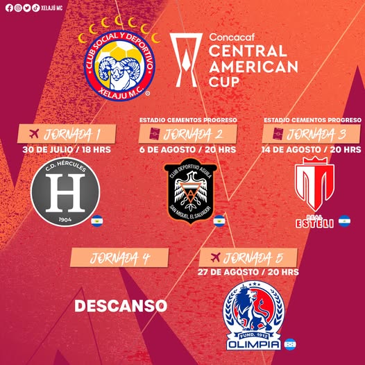 La segunda fecha y la tercera, el cuadro quetzalteco jugarán en el estadio Cementos Progreso, su casa en la Copa Centroamericana. Los duelos serán miércoles 6 y jueves 14 de agosto ante Águila de El Salvador y Real Estelí de Nicaragua, respectivamente. Ambos duelos serán a las 20:00 horas.
