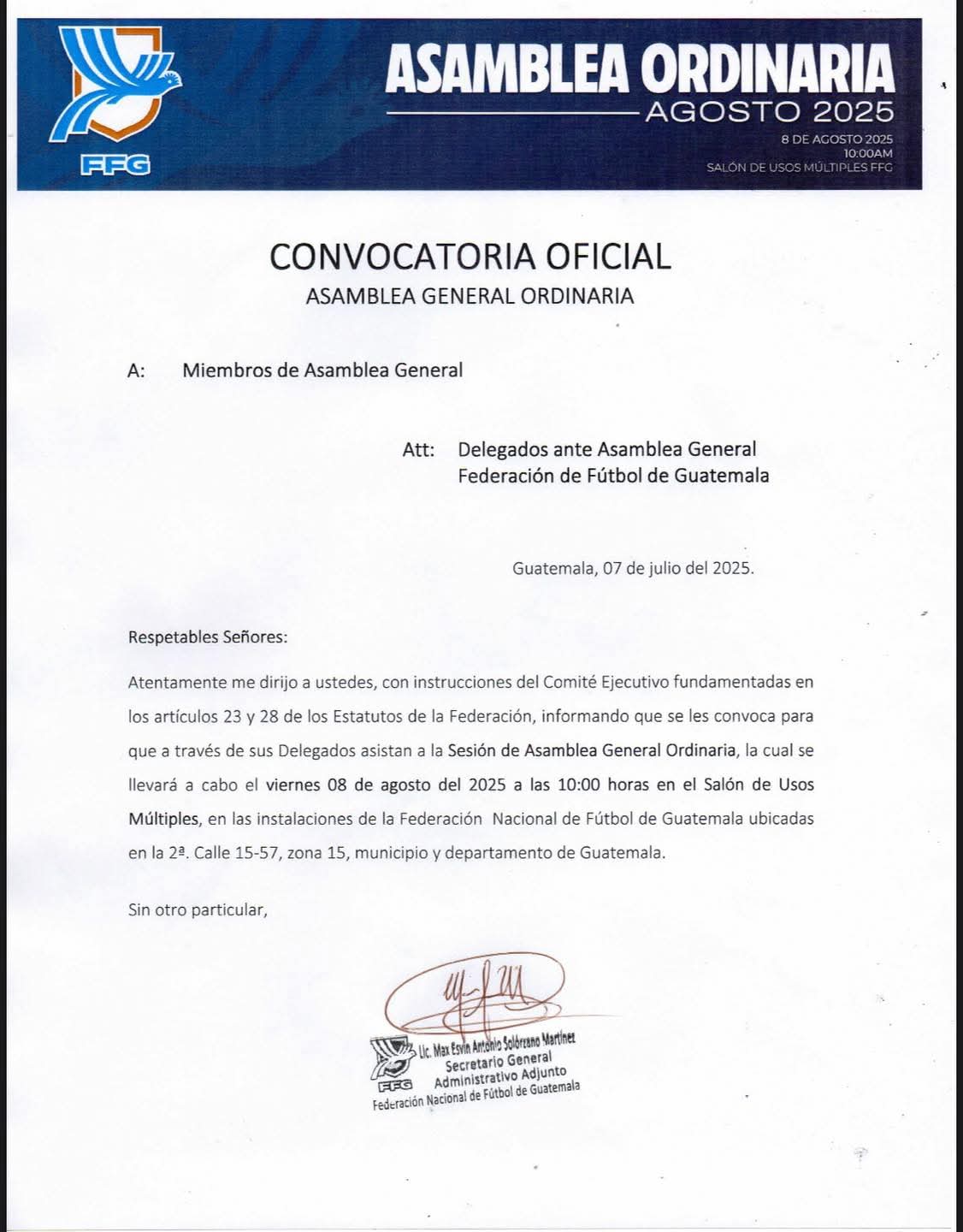 Ante ese mar de vacíos legales, la Federación del Futbol de Guatemala (FFG), convocó a los delegados ante la Asamblea General de la Federación a una Asamblea General Ordinaria la cual se realizará el 8 de agosto de 2025 a las 10:00 horas en el Salón de Usos Múltiples (SUM) de la FFG.