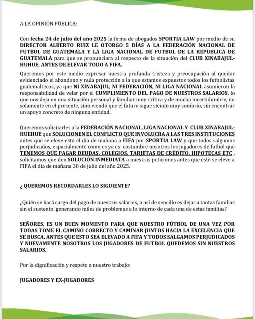 El plazo se venció este martes 29 de julio, y este miércoles 30 de julio, Xinabajul podría accionar a nivel internacional. Ante ese peligro inminente que pudiese representar tal acción, el grupo de jugadores y exjugadores han mostrado su "profunda tristeza y preocupación al quedar evidenciado el abandono y nula protección" a la que los profesionales están siendo expuestos.