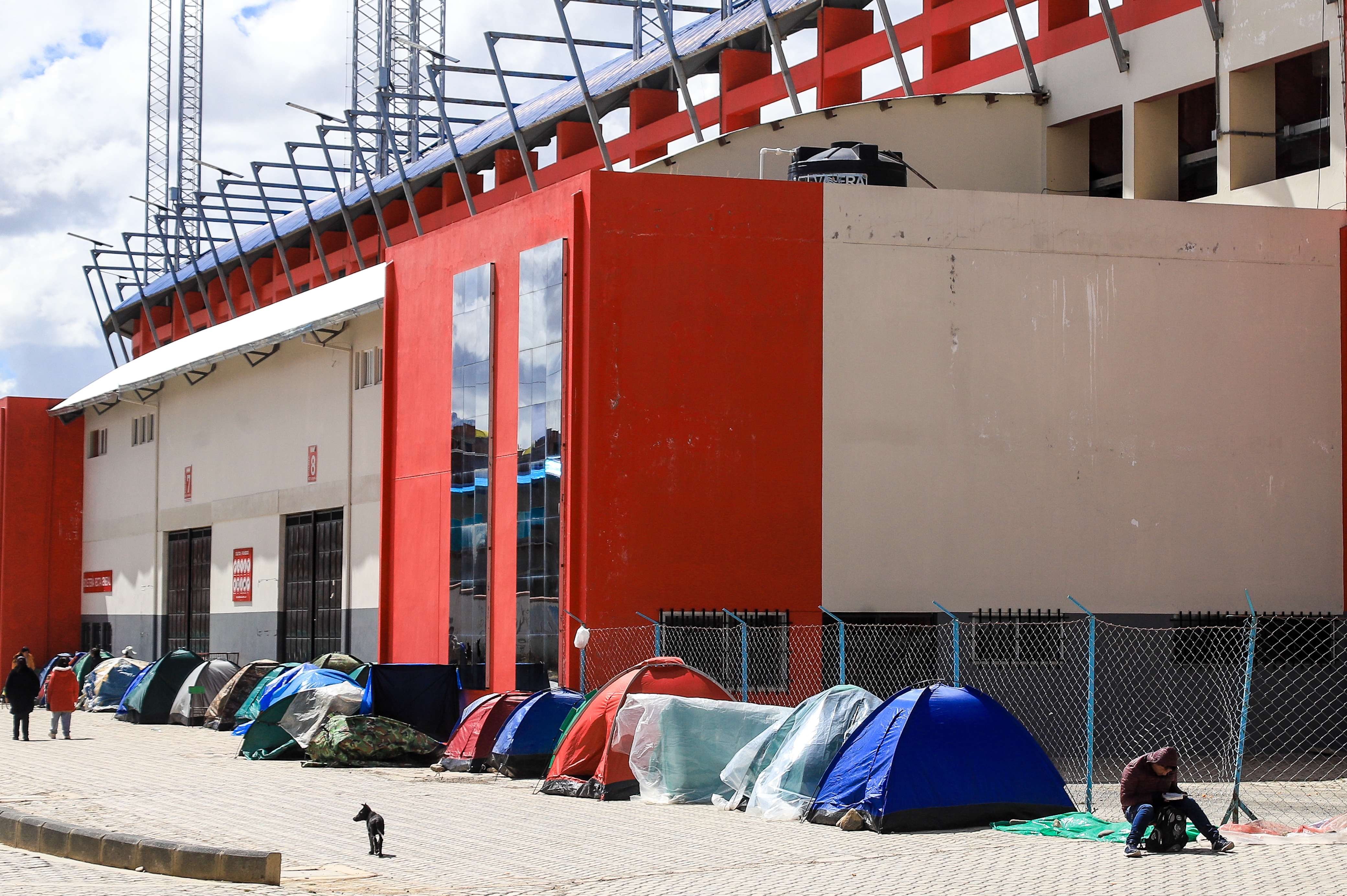 Las tiendas de diferentes colores y tamaños, y algunas cubiertas con plástico, rodean el estadio situado a 4.090 metros sobre el nivel del mar, donde las personas esperan, a pesar del frío y de la persistencia de los revendedores de boletos.