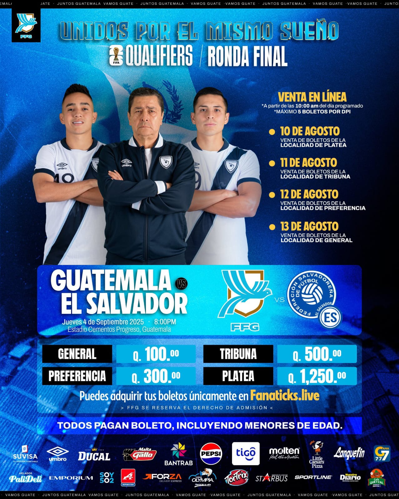 Las Selecciones de Guatemala y El Salvador se medirán el próximo jueves 4 de septiembre a las 20:00 horas en el estadio Cementos Progreso de la zona 6 capital como parte del inicio de la fase final del camino mundialista que conduce a la Copa del Mundo de la FIFA Estados Unidos, México y Canadá 2026.