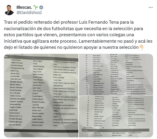 Mediante sus redes sociales, el diputado independiente (Semilla), David Illescas, dio a conocer detalles relacionados a la no aprobación de una iniciativa de ley que buscaba la nacionalización de forma rápida de los futbolistas, el argentino Cristian Hernández y el colombiano José Corena.