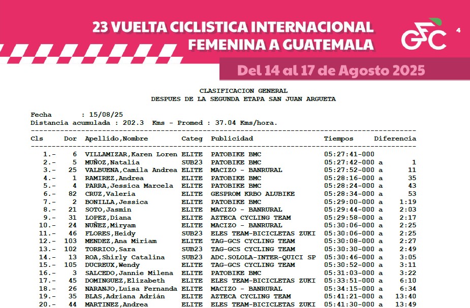 Este viernes 15 de agosto se realizó la segunda etapa de la vigésimo tercera Vuelta Femenina a Guatemala, donde los nombres a destacar son la de las ciclistas colombianas Natalia Muñoz y Karen Villamizar, la primera por ser la ganadora de etapa y la segunda por mantener el liderato general de la competencia.
