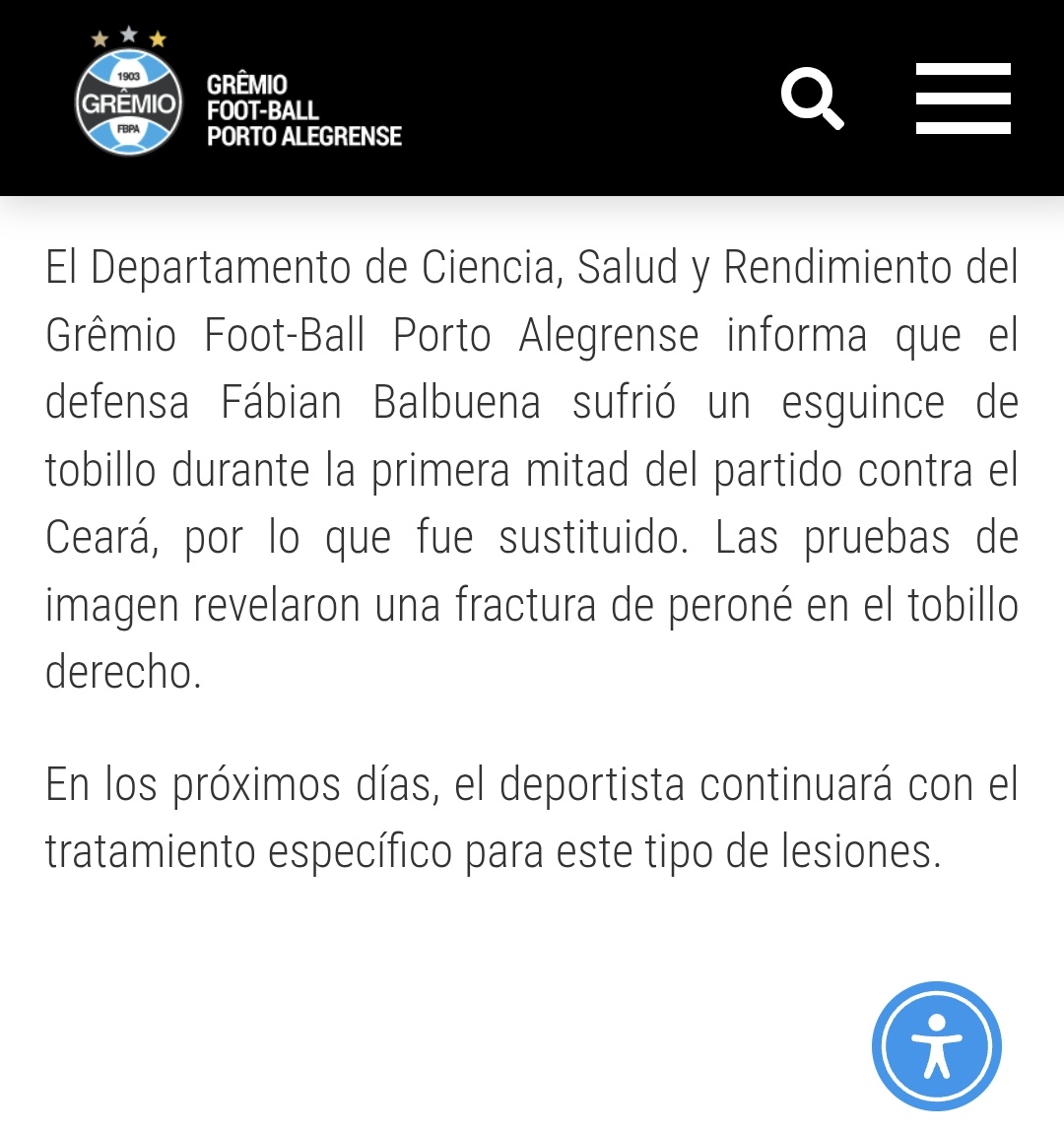 El Gremio confirmó este domingo que el defensa paraguayo, Fabián Balbuena, ha sufrido una fractura de peroné, por lo que no podrá jugar con la selección de su país en las últimas dos jornadas de la eliminatoria mundialista sudamericana.