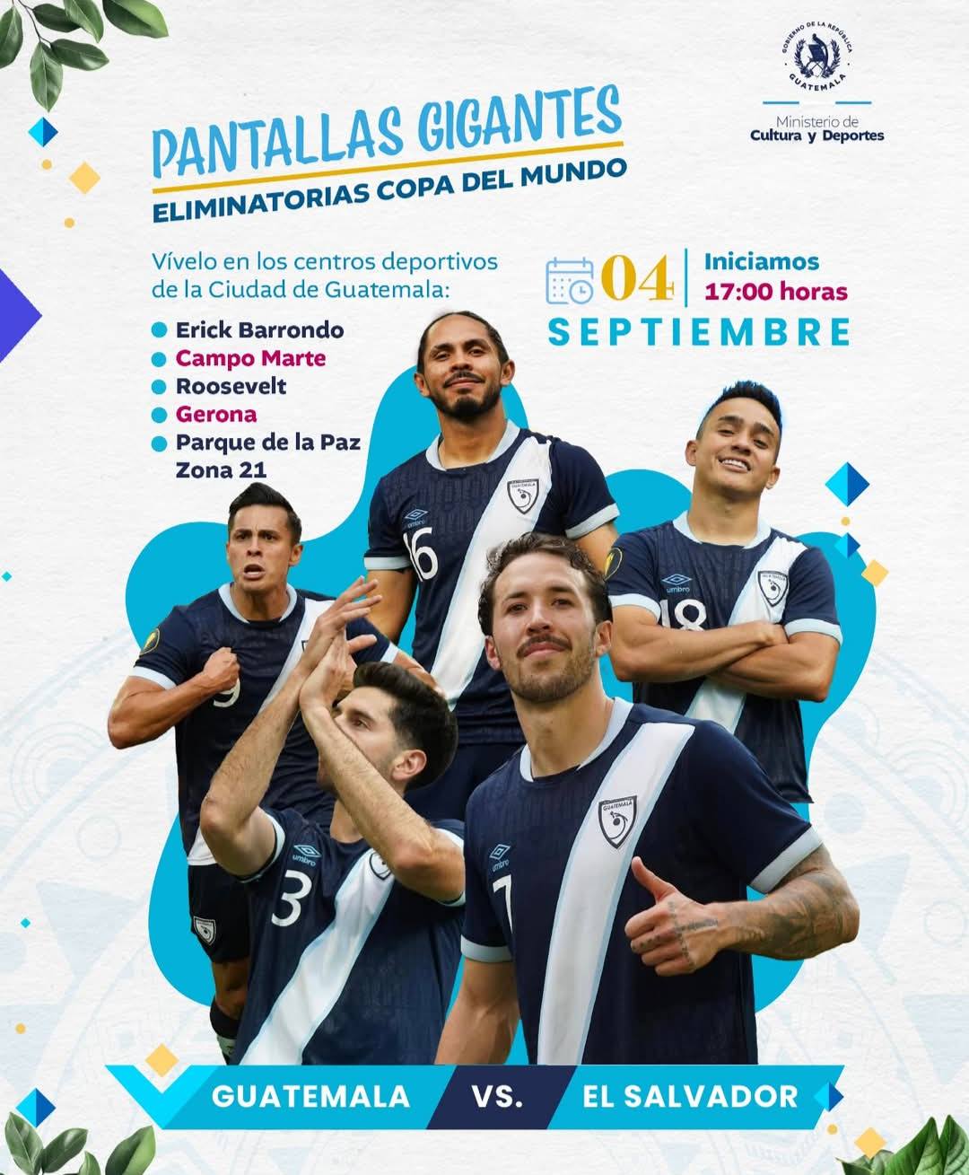 El Ministerio de Cultura y Deportes anunció la instalación de pantallas gigantes en distintos centros deportivos del país, con el objetivo de que los guatemaltecos puedan disfrutar juntos del esperado encuentro entre la Selección Nacional de Guatemala y El Salvador.