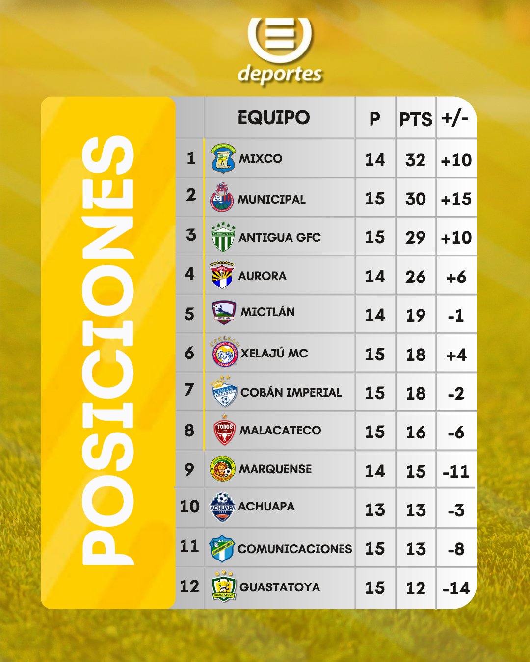 Deportivo Mixco lidera la tabla con 32 puntos, dos más que Municipal (30), pero con el benefició aún que le queda pendiente un partido para igualar las15presentaciones del "Rojo", situación que podría aprovechar más adelante y llegar a tener cinco puntos de diferencia ante su más cercano perseguidor.