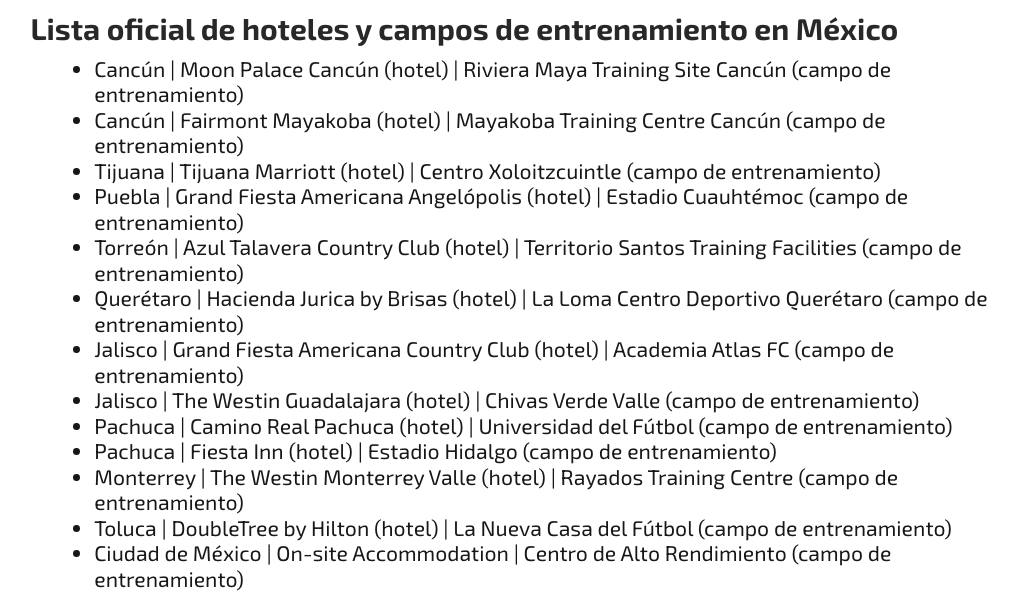 La FIFA dio a conocer la lista oficial de hoteles y sedes de entrenamiento en México para la Copa del Mundo 2026, que se realizará de manera conjunta con Estados Unidos y Canadá. Además de Ciudad de México, Guadalajara y Monterrey, que albergarán partidos oficiales, el país vecino contará con 13 complejos en nueve ciudades destinados a alojamiento y prácticas para las selecciones.