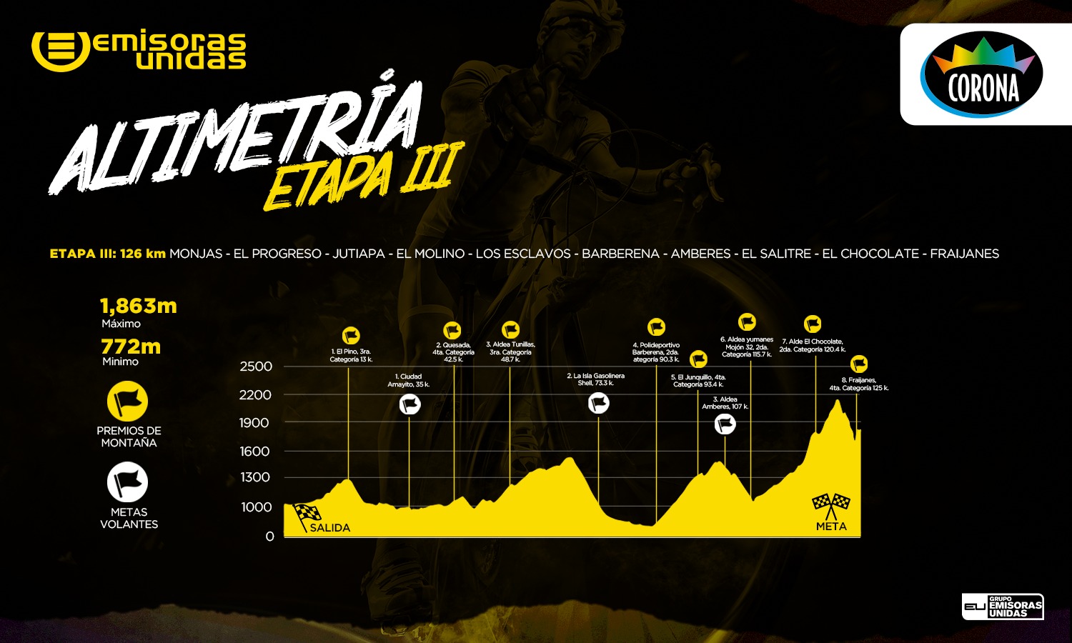 La ruta recorrerá lugares emblemáticos como El Progreso, Jutiapa, El Molino, Los Esclavos, Barberena, Amberes, El Salitre, El Chocolate y Fraijanes, dibujando un trazado tan pintoresco como demandante. En el camino se disputarán tres metas volantes ubicadas en Ciudad Amayito (km 35), La Isla - Gasolinera Shell (km 73.3) y Aldea Amberes (km 107), que podrían ser decisivas para los velocistas que buscan puntos importantes en la clasificación intermedia. Además, los corredores deberán superar ocho premios de montaña, entre ellos los exigentes ascensos de El Pino (3ª categoría, km 13), Polideportivo Barberena (2ª categoría, km 90.3) y Aldea Yumanes (2ª categoría, km 115.7), lo que anticipa una jornada sumamente dura y estratégica.
