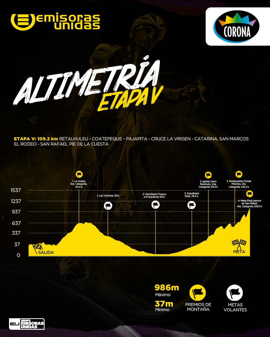 Cuatro premios de montaña y tres metas volantes conformarán los premios intermedios de este evento ciclístico que terminará en San Rafael Pie de la Cuesta, San Marcos.