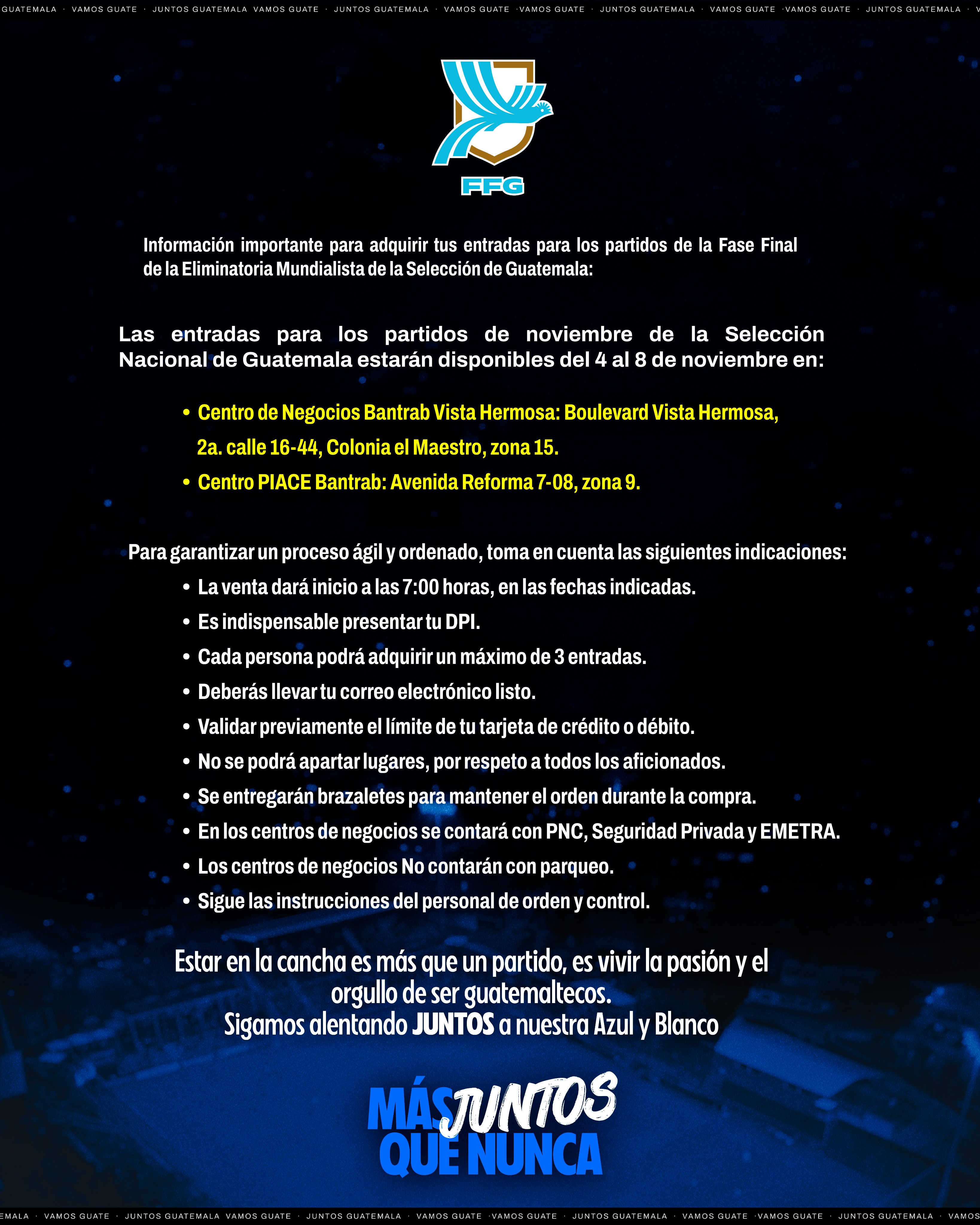 La Federación de Futbol de Guatemala (FFG), antes llamada Fedefut, dio a conocer una serie de indicaciones para que los aficionados tengan en cuenta al momento de adquirir los boletos para los partidos eliminatorios entre Guatemala y las selecciones de Panamá y Surinam, los cuales se disputarán en el mes de noviembre del presente año, y donde la "Bicolor" buscará su primera clasificación a la Copa del Mundo de la FIFA en selecciones mayores.