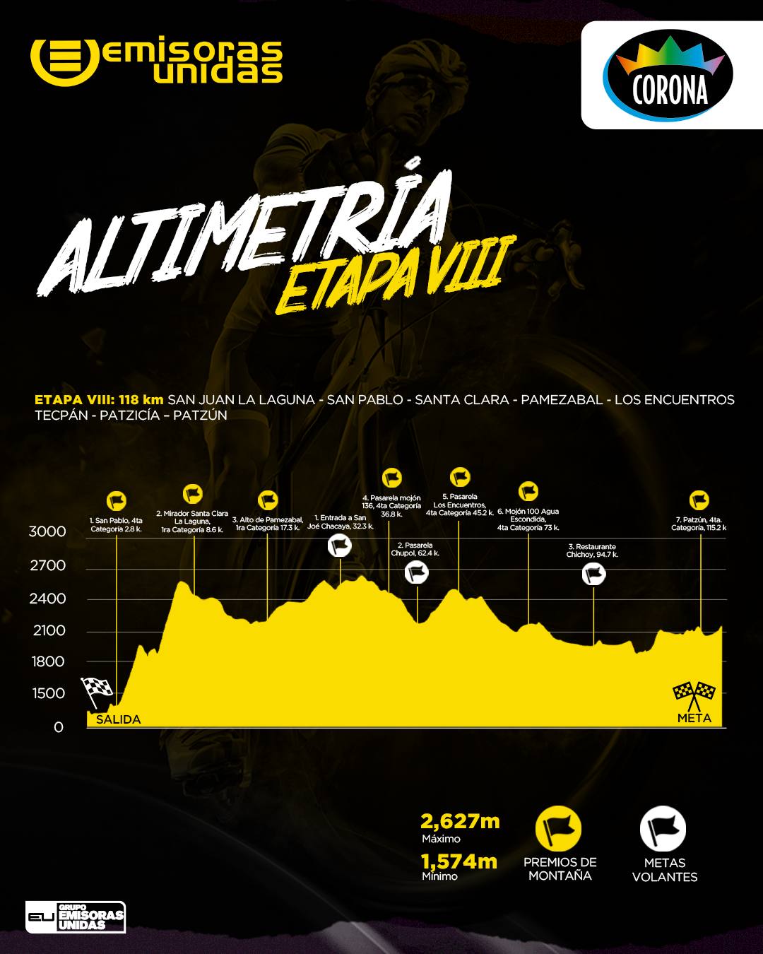 Entonces, la etapa número 8 de la Vuelta Ciclística Internacional comenzará a las 10:00 hora con una largada de 118 kilómetros y que tendrá como punto de salida el municipio de Sololá, Sa Juan La Laguna.
