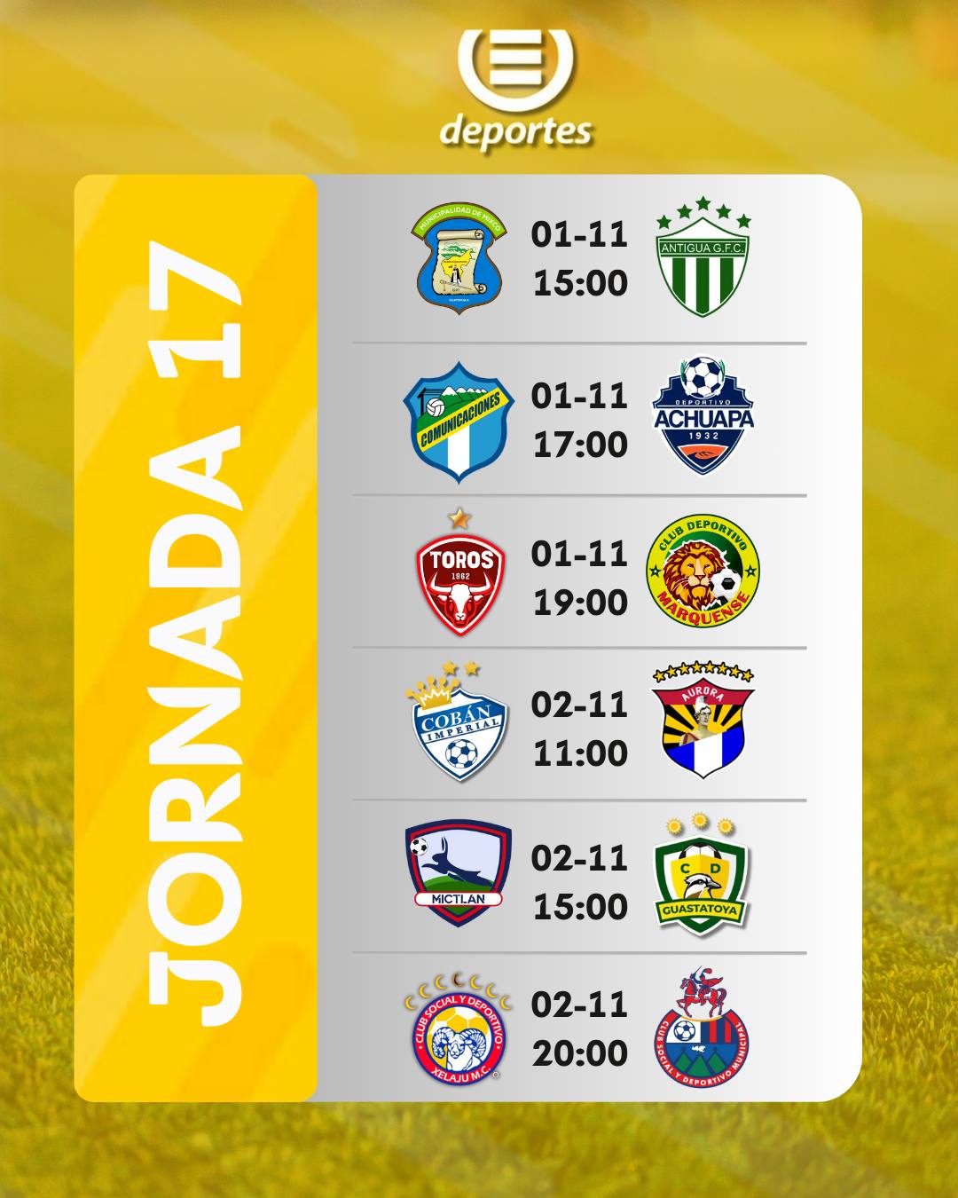 Este fin de semana se disputará la jornada 17 del Torneo Apertura 2025 del fútbol guatemalteco, una fecha que puede ser determinante tanto en la lucha por los primeros lugares como en la pelea por evitar el descenso. Los duelos programados presentan atractivos enfrentamientos que podrían modificar el panorama general de la clasificación. Desde Mixco hasta Quetzaltenango, la emoción está garantizada en una fecha que se jugará entre el sábado 1 y el domingo 2 de noviembre.