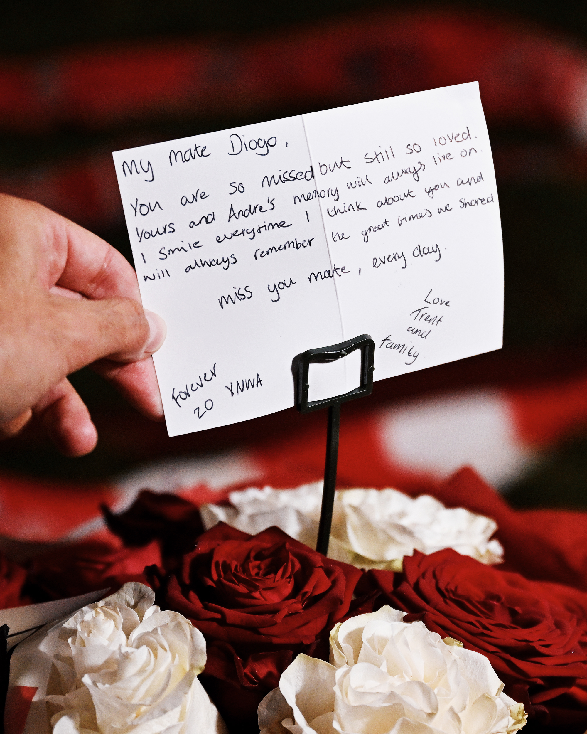 Un momento muy especial y emotivo lo protagonizó Trent, que quiso desplazarse al estadio donde se formó como jugador y en el que compartió éxitos con Diogo Jota, para dejar unas flores con los colores del Liverpool y una carta sentida.