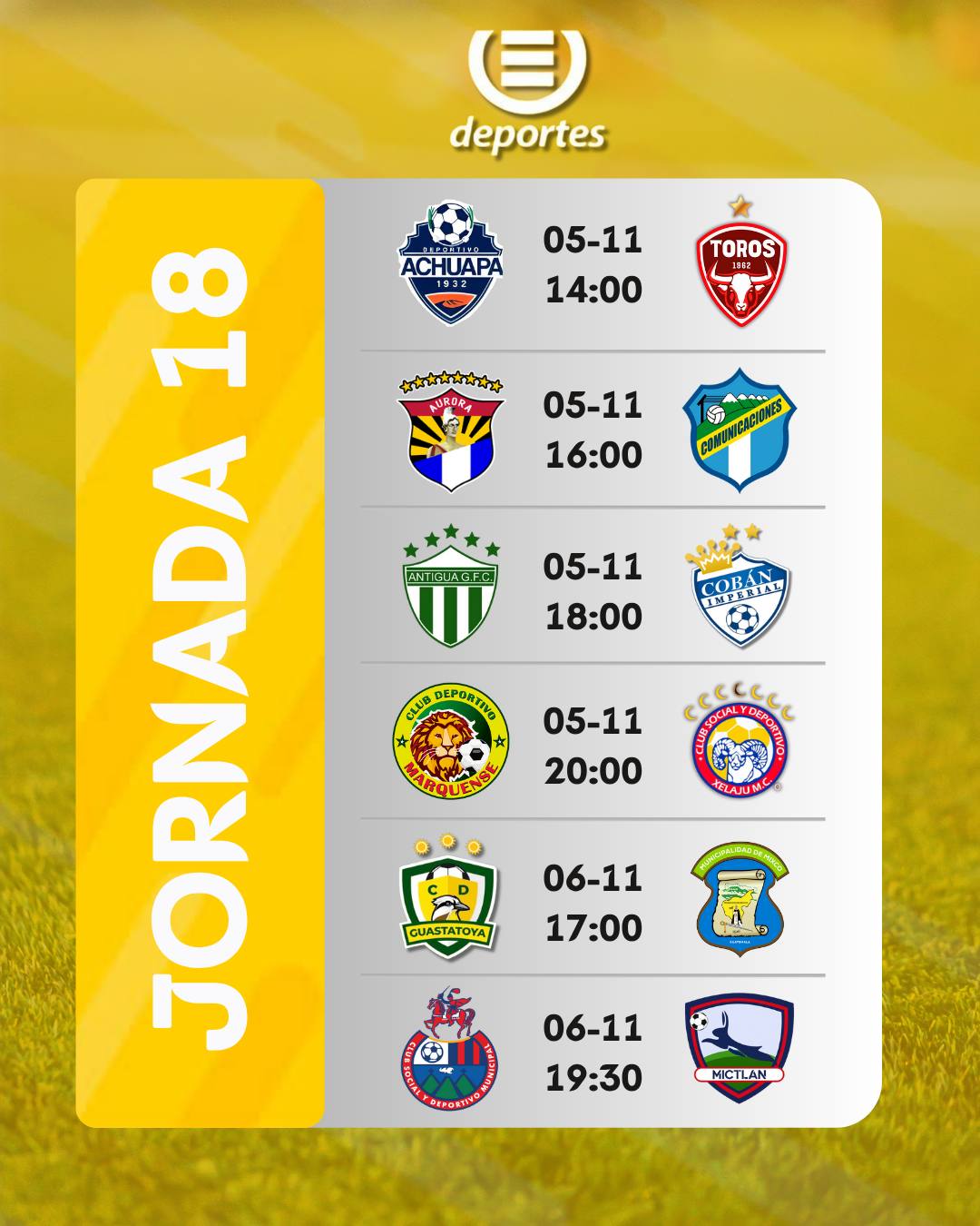 Además, la fecha 18 del Apertura 2025, que se juega entre miércoles 5 y jueves 6 de noviembre, da la posibilidad al Aurora y al Antigua a sellar boleto para los cuartos de final, donde ya está clasificado de forma anticipada el Deportivo Mixco y Municipal.