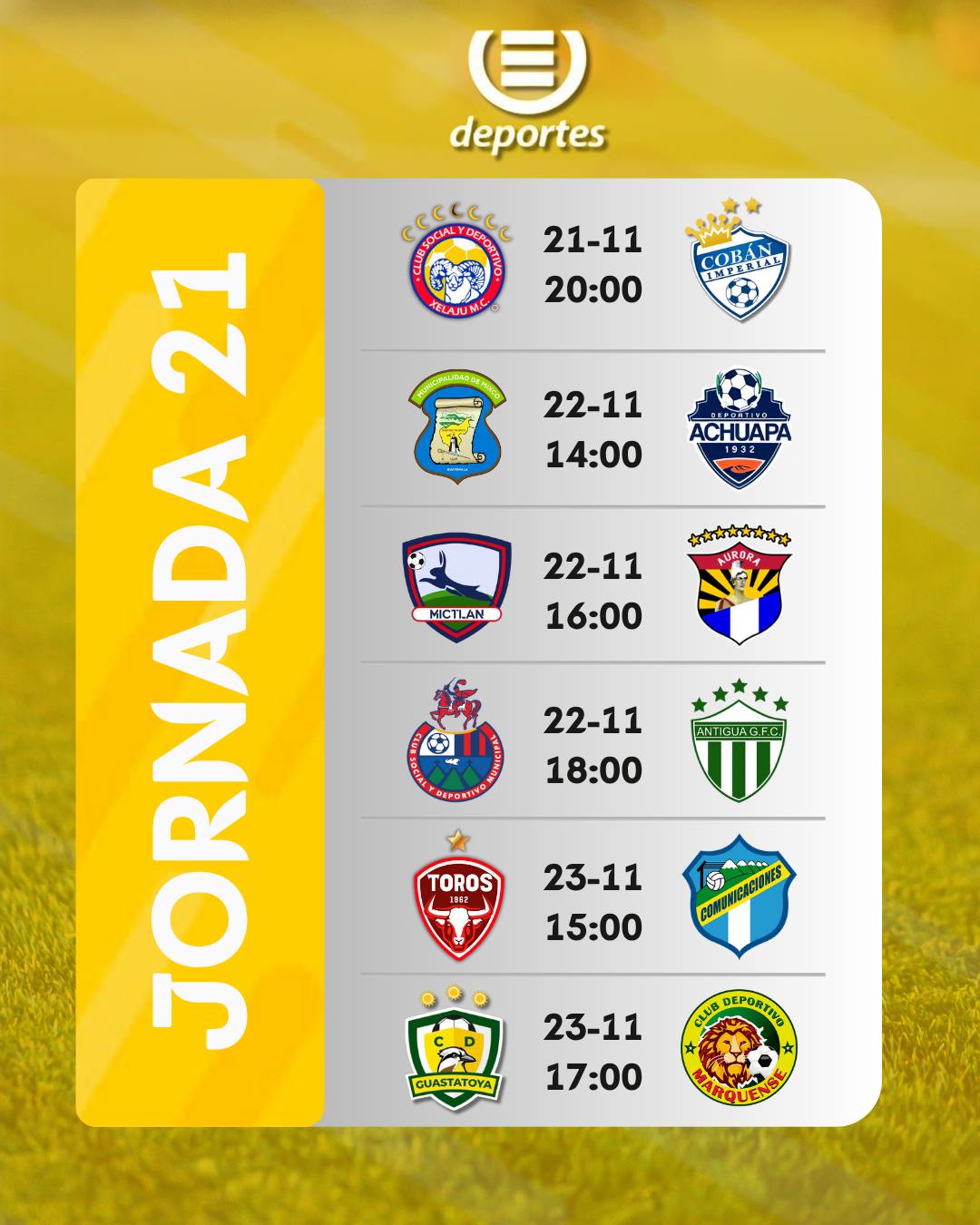 Este viernes arranca la jornada 21 con el duelo entre el octavo lugar de la competencia, Xelajú, y el noveno, Cobán Imperial. Ambos tienen 22 puntos, y el duelo será en la casa del "Superchivo" a las 20:00 horas.