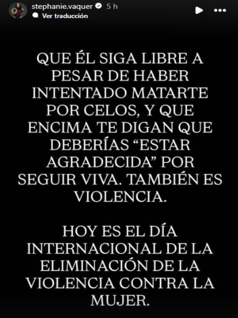 En su historia, la luchadora escribió: "Que él siga libre a pesar de haber intentado matarte por celos, y que encima te digan que deberías ‘estar agradecida’ por seguir viva. También es violencia. Hoy es el Día Internacional de la Eliminación de la Violencia contra la Mujer".