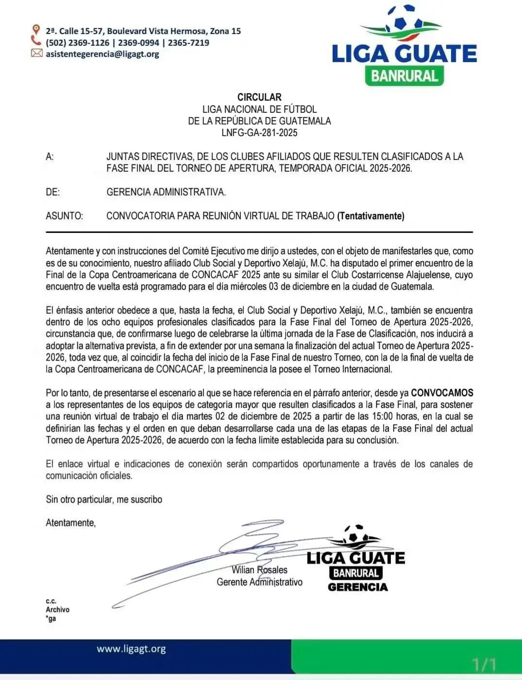 El conjunto altense llega a este escenario tras empatar 1-1 en el duelo de ida de la final de la Copa Centroamericana, celebrado en el Estadio Alejandro Morera Soto, en Alajuela, ante la Liga Deportiva Alajuelense. El resultado deja abierta la serie y obliga a Xelajú a concentrarse plenamente en el compromiso de vuelta, programado para el miércoles 3 de diciembre. La Liga Nacional reconoció en su comunicado que, por tratarse de un torneo internacional, este evento tiene prioridad sobre la programación del certamen doméstico.