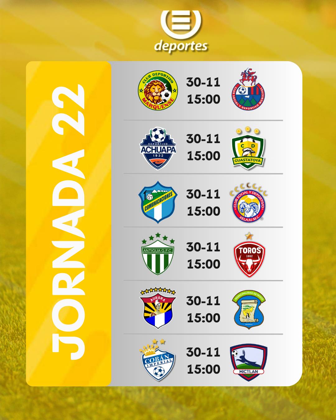 La última jornada de la fase de clasificación del Torneo Apertura 2025 de la Liga Nacional de Guatemala promete ser uno de los capítulos más vibrantes del certamen. Este domingo 30 de noviembre, a las 15:00 horas, los seis partidos se disputarán de forma simultánea en distintos estadios del país, garantizando una tarde cargada de emociones, tensión y mucha expectativa. Todo está servido para que la fecha 22 defina no solo al líder general, sino también a los equipos que completarán el cuadro de clasificados a la liguilla.