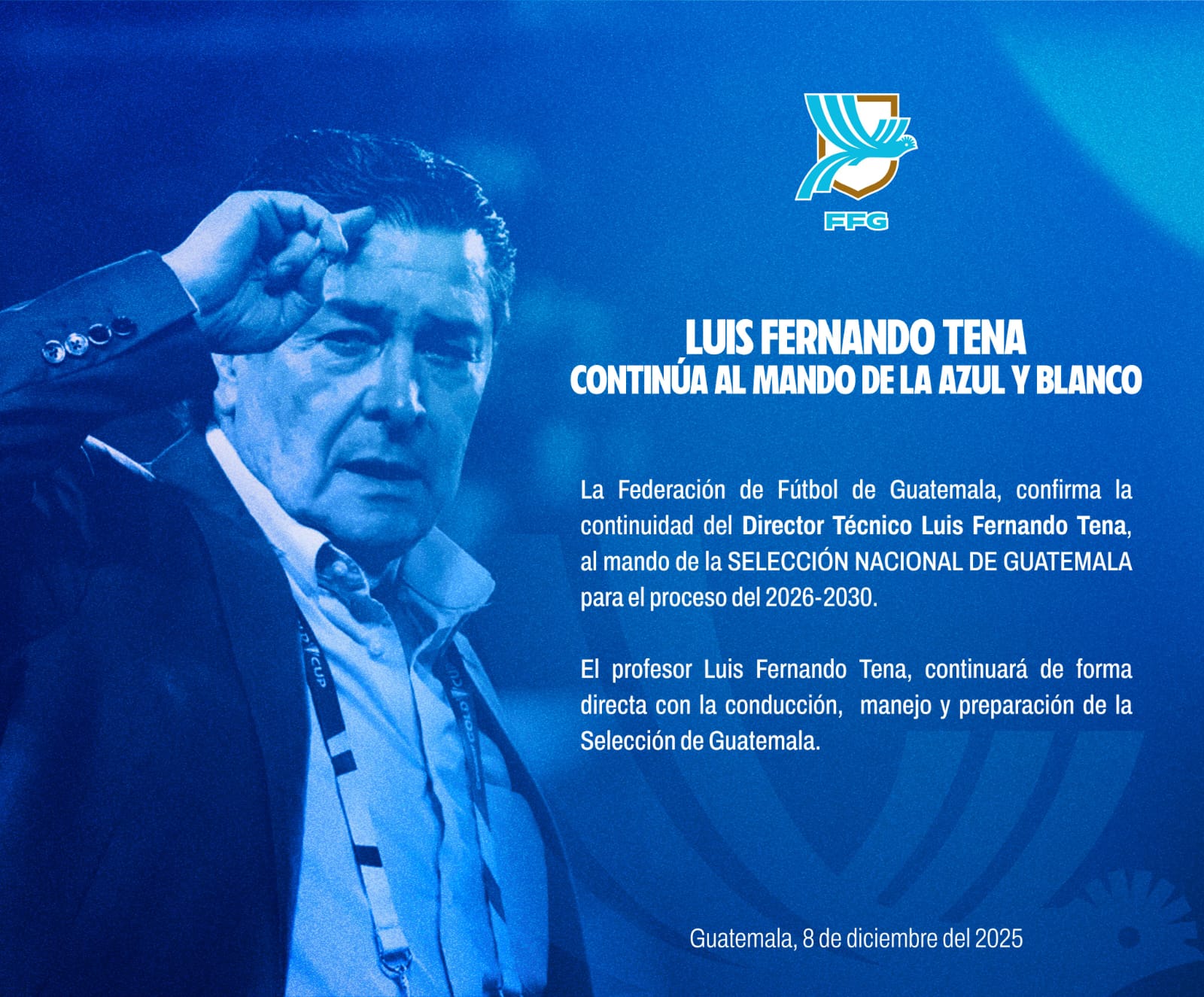 "La Federación de Futbol de Guatemala confirma la continuidad del director técnico Luis Fernando Tena al mando de la selección Nacional de Guatemala para el proceso del 2026-230", detalló la Federación en un comunicado que fue socializado este día en las distintas plataformas digitales.