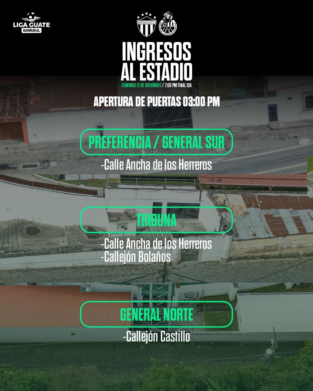 Asimismo, Antigua publicó esta tarde detalles relacionados a la apertura de las puertas del estadio Pensativo para el ingreso de los aficionados. Según los antigüeños, las puertas se abrirán desde las 15:00 horas, y será de esta forma: