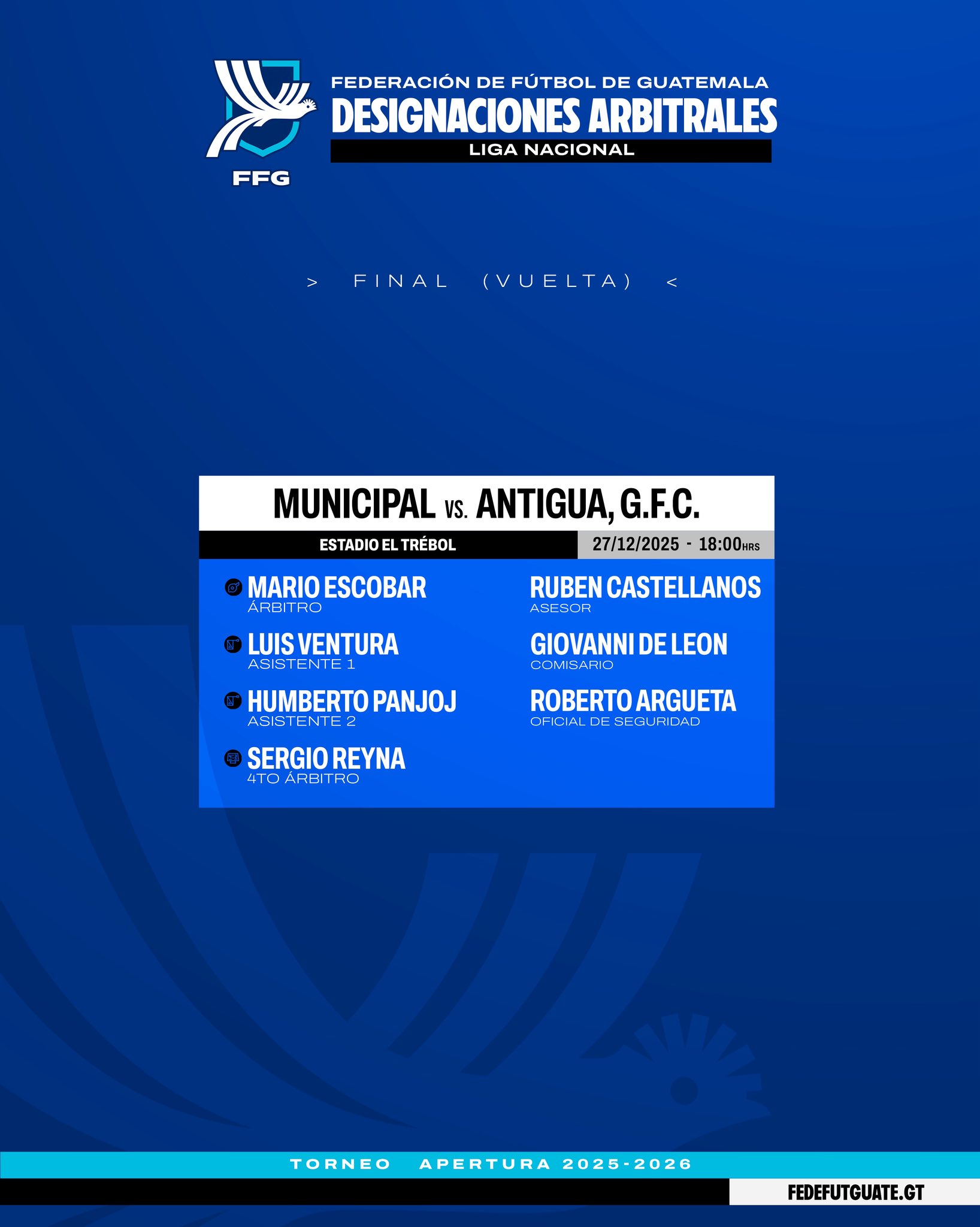 Mario Escobar fue designado por la Comisión de Árbitros y Departamento de Arbitraje de la Federación de Futbol de Guatemala como el encargado de la final de vuelta del Torneo Apertura 2025 de la Liga Nacional entre Municipal y Antigua G. F. C., duelo que se jugará el próximo sábado 27 de diciembre a las 18:00 horas en el estadio Manuel Felipe Carrera de El Trébol.