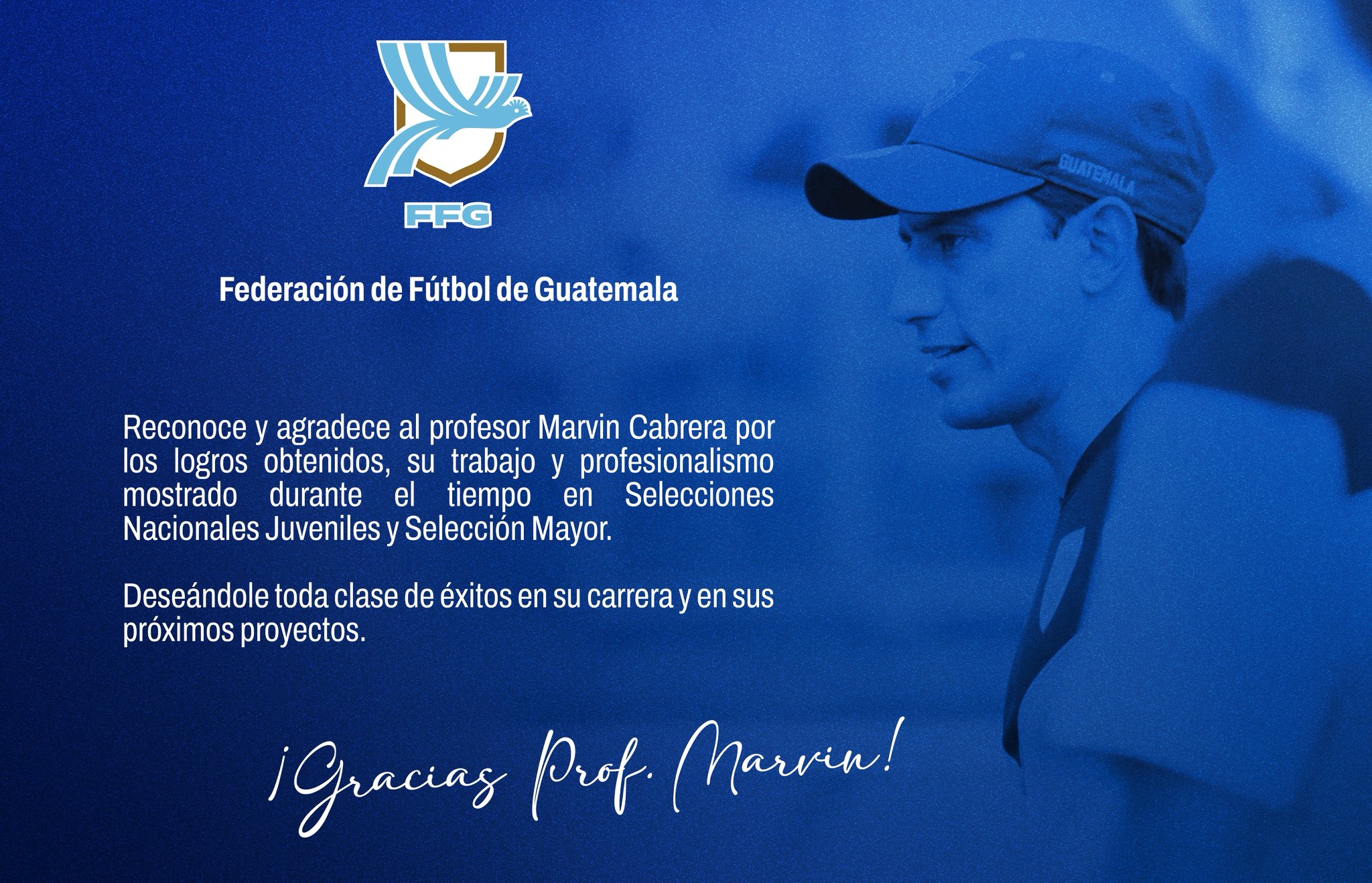 "FFG reconoce y agradece al profesor Marvin Cabrera los logros obtenidos, su trabajo y profesionalismo mostrado durante el tiempo en selecciones nacionales juveniles y la mayor", así fue el mensaje de despedida por parte de la Federación para Cabrera.
