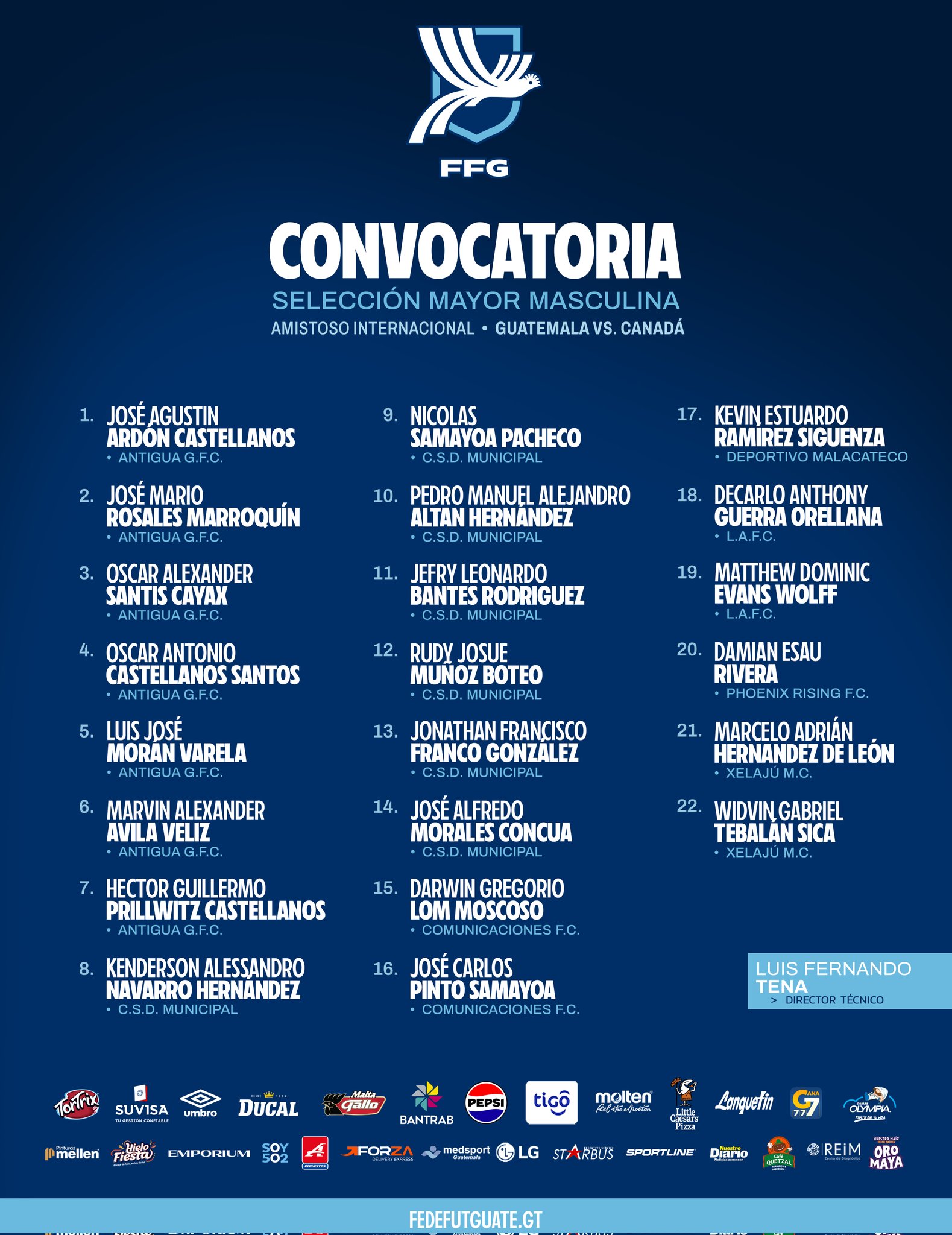 La Federación de Futbol de Guatemala (FFG) reveló el listado de 22 jugadores convocados por el técnico mexicano Luis Fernando Tena para el duelo amistoso del próximo 17 de enero que sostendrán las Selecciones de Canadá y Guatemala en territorio estadounidense.