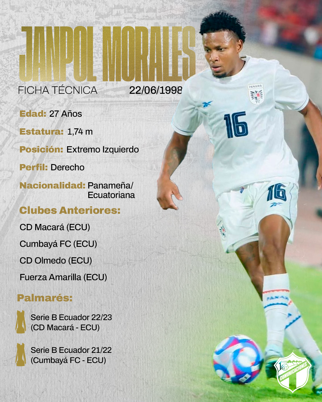 Dentro de la ficha de presentación de Janpol Morales se destaca que nació un 22 de junio de 1998, y con 27 años de edad se desarrolla como un extremo izquierdo, que tiene perfil derecho.