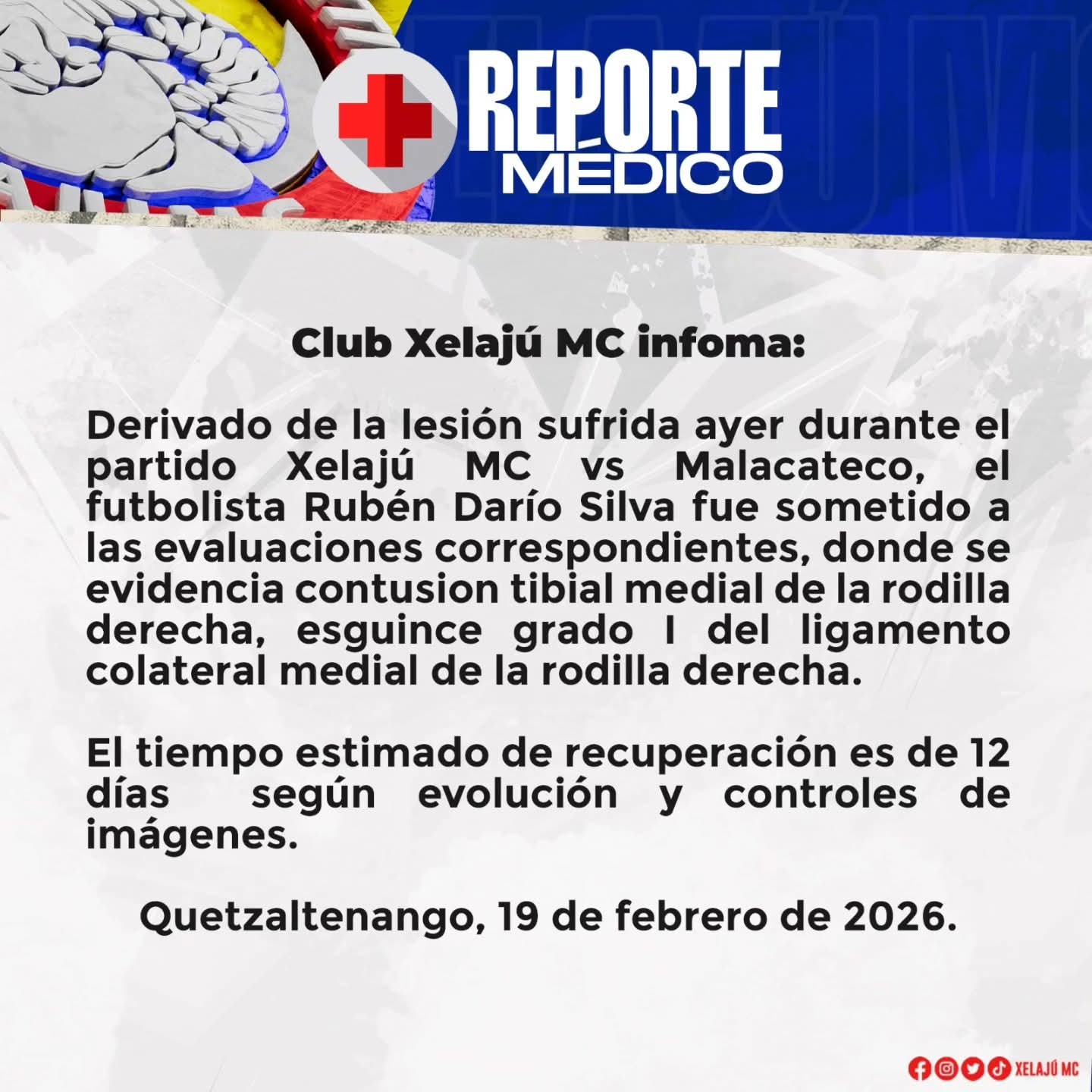El Xelajú M. C. brindó el parte médico del portero uruguayo Rubén Darío Silva, quien salió lesionado en el duelo que su club enfrentó a Deportivo Malacateco el pasado miércoles 18 de febrero como parte de la séptima fecha del Torneo Clausura 2026 de la Liga Nacional.