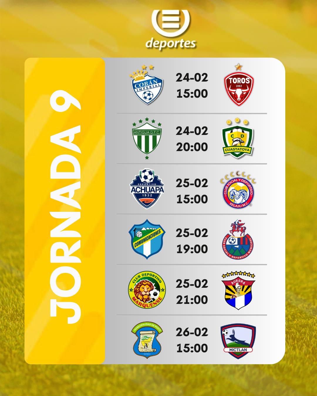 Esta es la programación de partidos para la novena jornada del Torneo Clausura 2026 de la Liga Nacional de Fútbol de Guatemala: