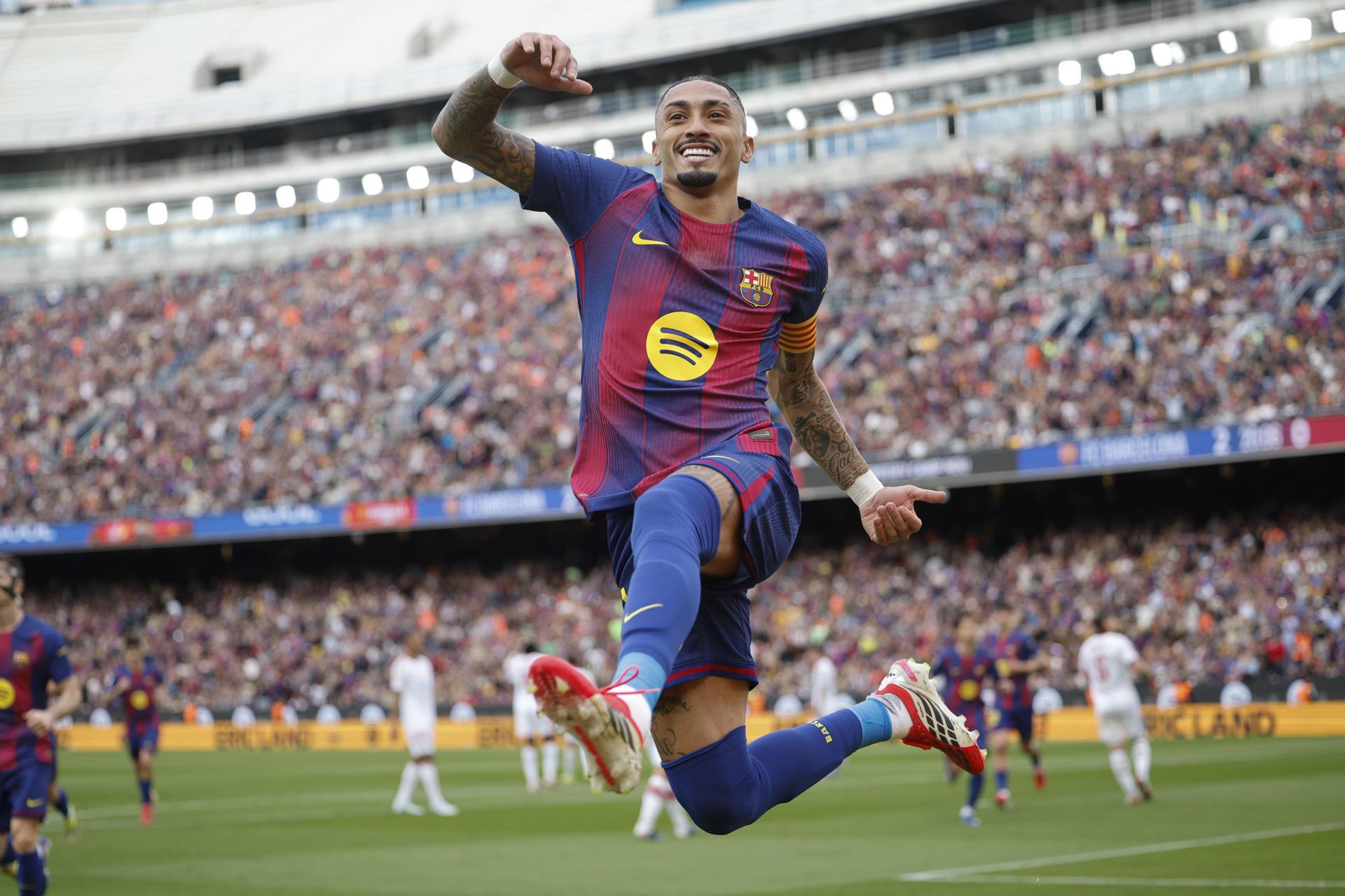La gran figura del partido fue Raphinha, quien firmó un triplete en la victoria ante los sevillanos con goles a los minutos 7, 20 y 51. Dos de esas anotaciones llegaron desde el punto penal, sin mayores objeciones por parte de la defensa visitante. Los otros tantos del conjunto catalán fueron obra de Dani Olmo al minuto 38 y de João Cancelo al 60.